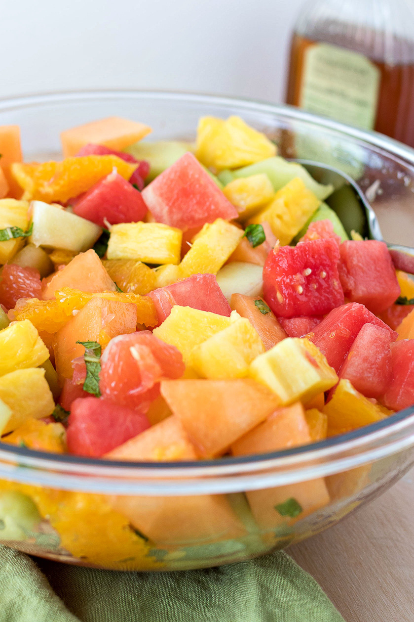 Pineapple & Melon Fruit Salad with Citrus Mint Dressing – A super refreshing fruit salad made with watermelon, cantaloupe, honeydew, pineapple, orange segments, grapefruit segments, chopped mint, and a hint of honey. The perfect addition to any summer party, picnic, or BBQ!