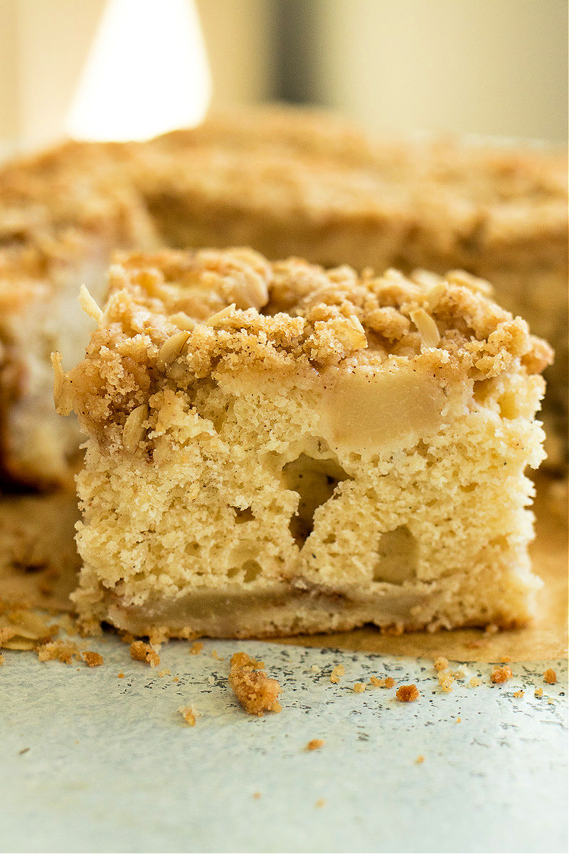 slice of pear coffee cake, shot from the side to reveal the moist center